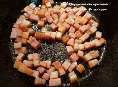 Беконът се нарязва на кубчета и се запържват в кравето масло за 3-4