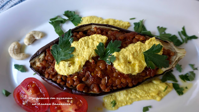 Пълнени патладжани с леща и сос от кашу (Веган)