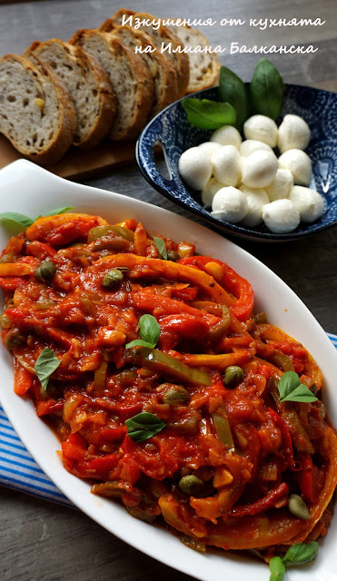 в нея и температурата се намалява на 180 градуса. Пече се 30-35 минути, докато